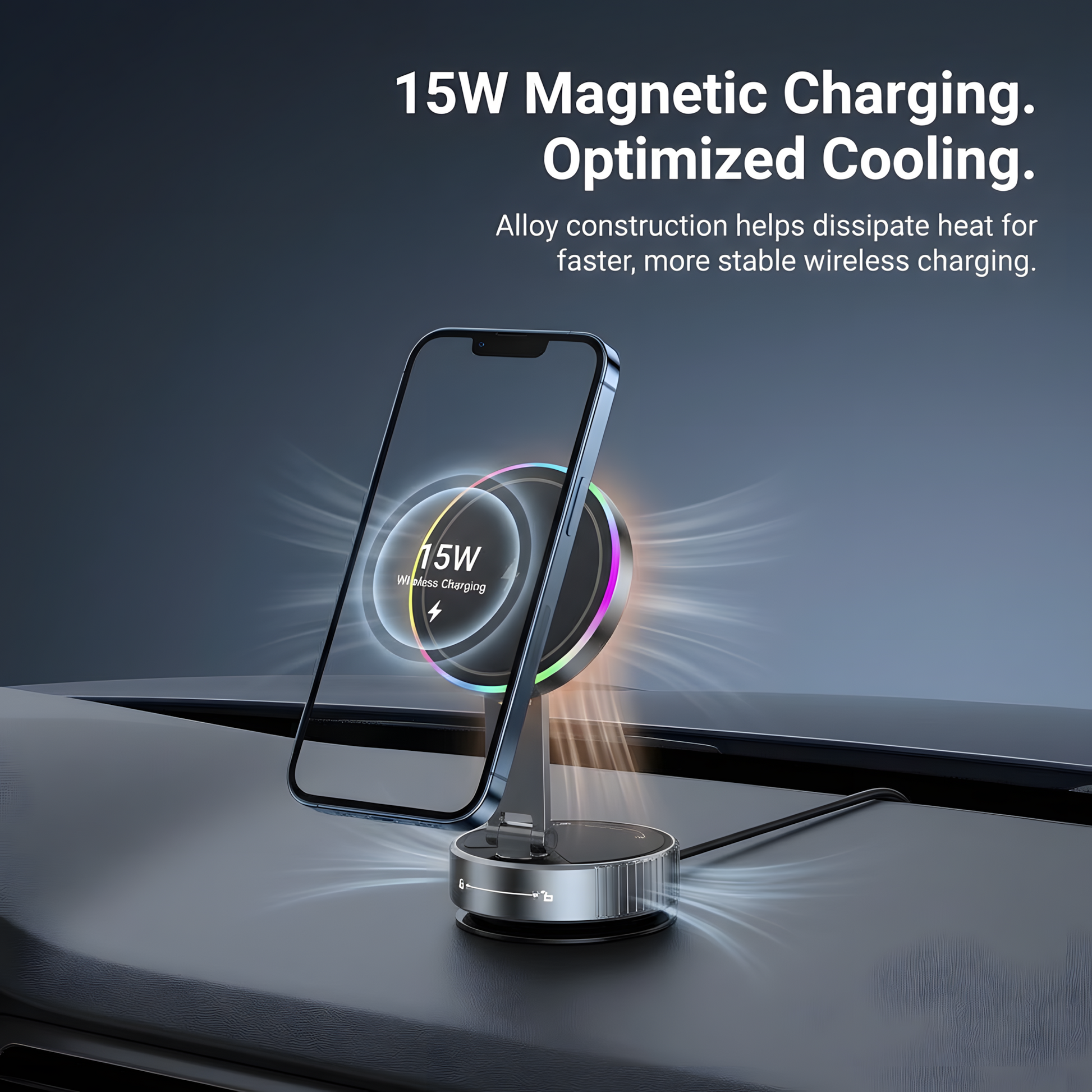 Snap your phone into place for fast, reliable charging with built-in alloy cooling to prevent overheating.