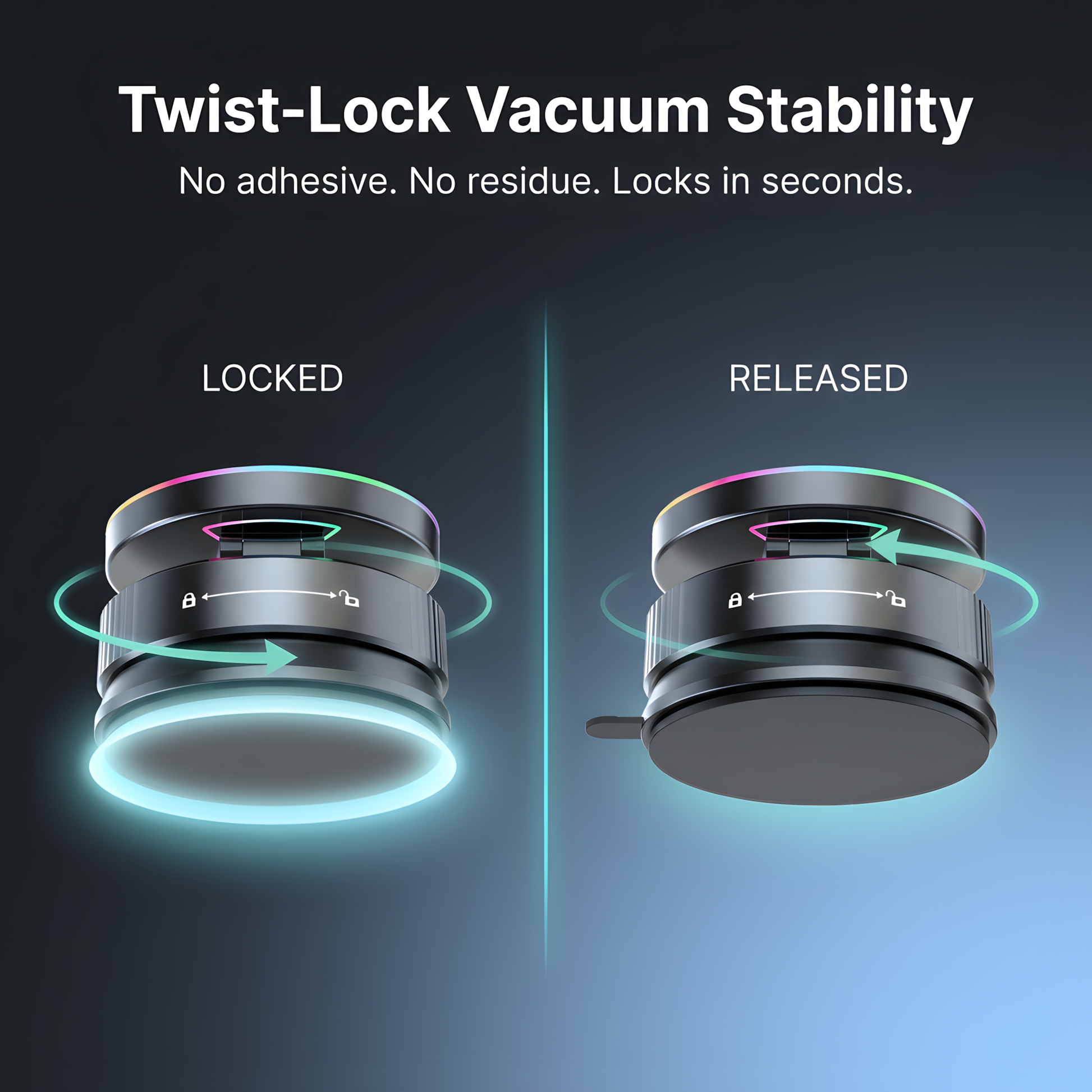 Locks firmly to smooth surfaces with a simple twist — no adhesive, no residue, no dashboard damage.